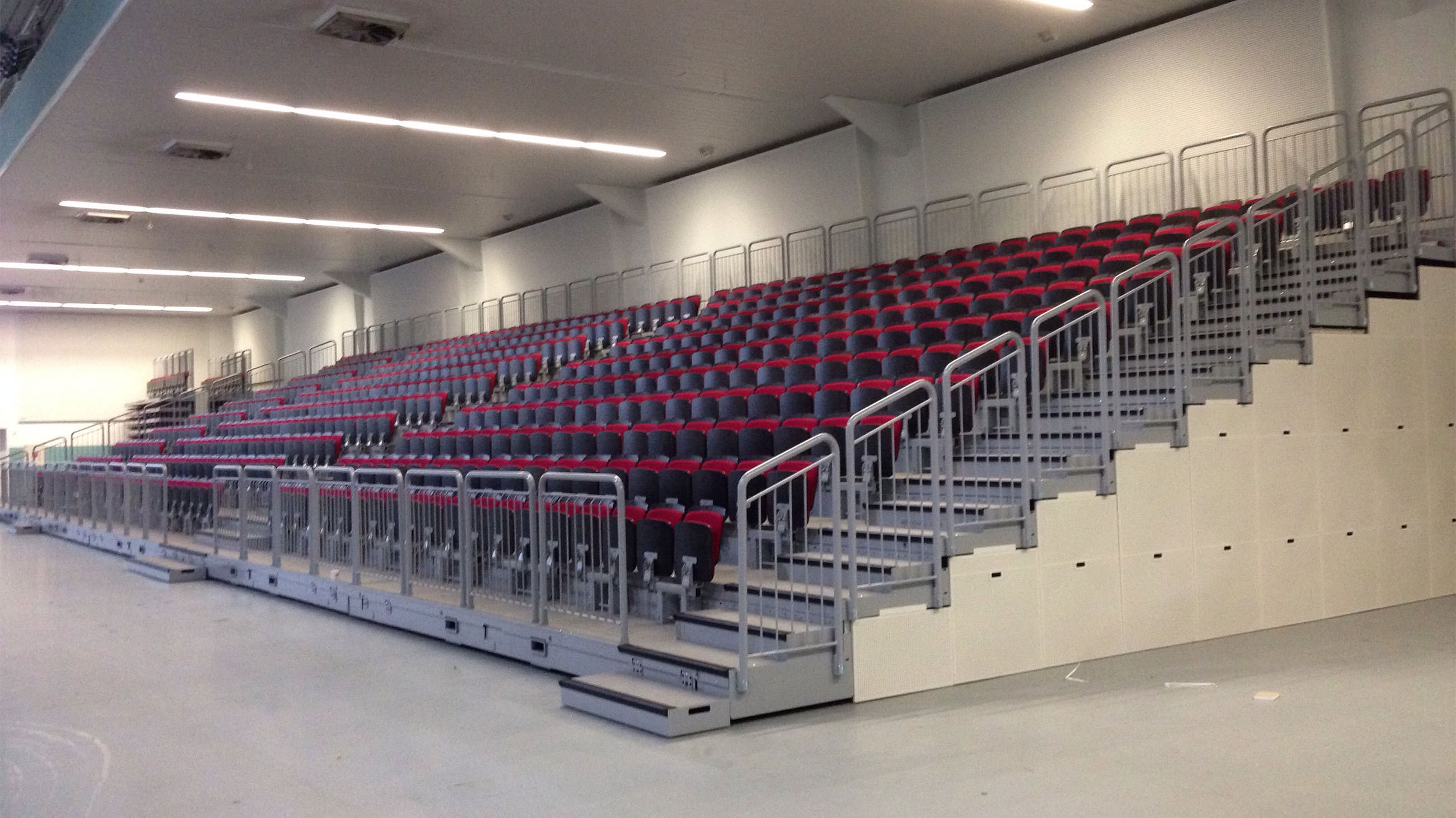 In dem vorgestellten Referenzobjekt besteht das ganze System aus 12 Blöcken, sodass für eine Gesamtbesucheranzahl von 1200 Personen in wenigen Stunden die Tribünen an die jeweilige Veranstaltung angepasst werden kann.