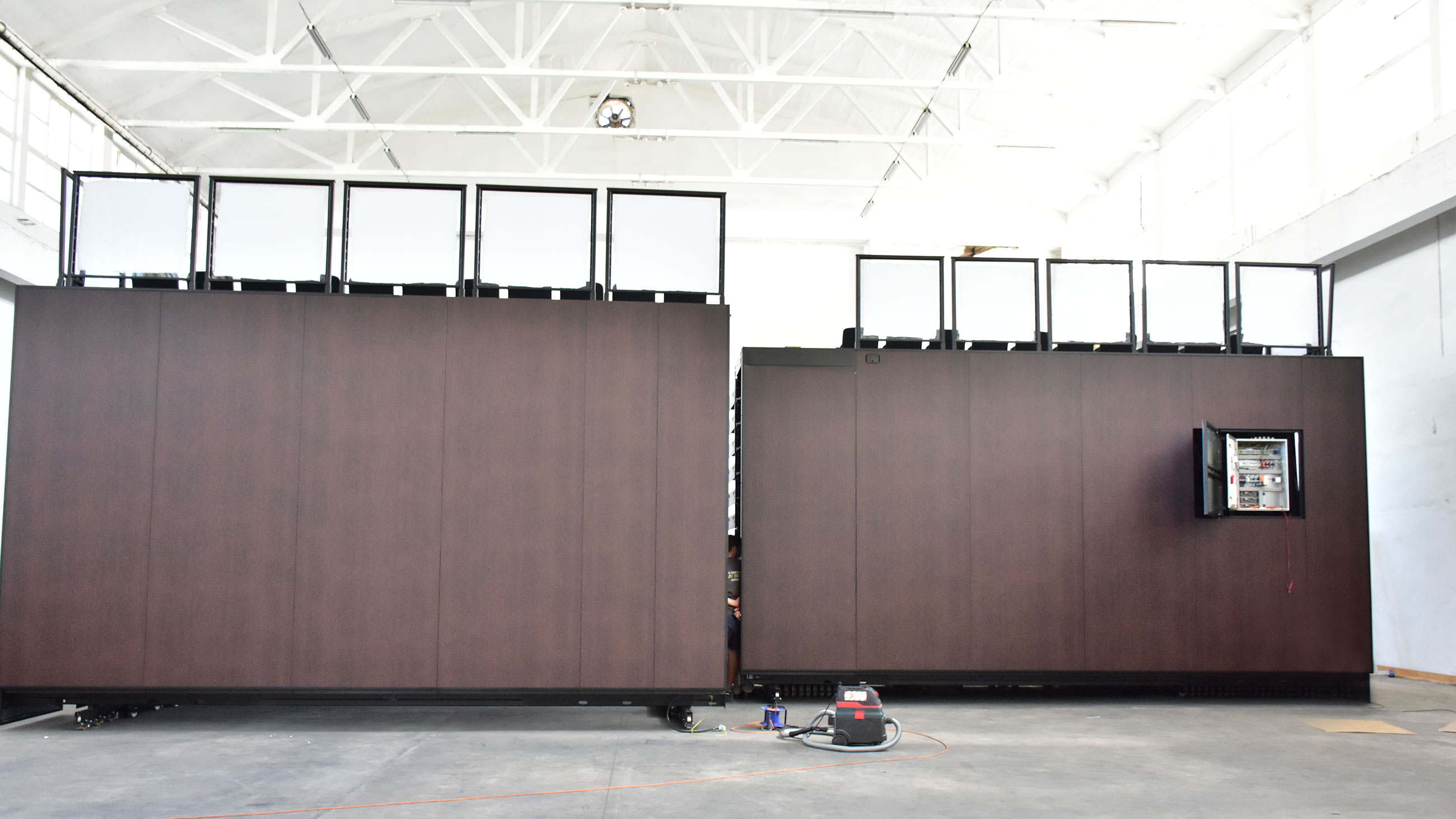 Der Tribünenblock ist zweigeteilt, um mit dem Gewicht unter 10to zu kommen. Ausserdem ist das Handling von 6m breiten Blöcken bei engeren Hallen wesentlich einfacher und schneller. Die beiden Tribünenhälften werden vor dem öffnen mit 4 Verbindungsklammern verbunden und dann gemeinsam geöffnet. Um jeden Spalt zwischen den Tribünenteilen zu verhindern, gibt es ein mit einem qick-lock System versehenen Einlegeteil.