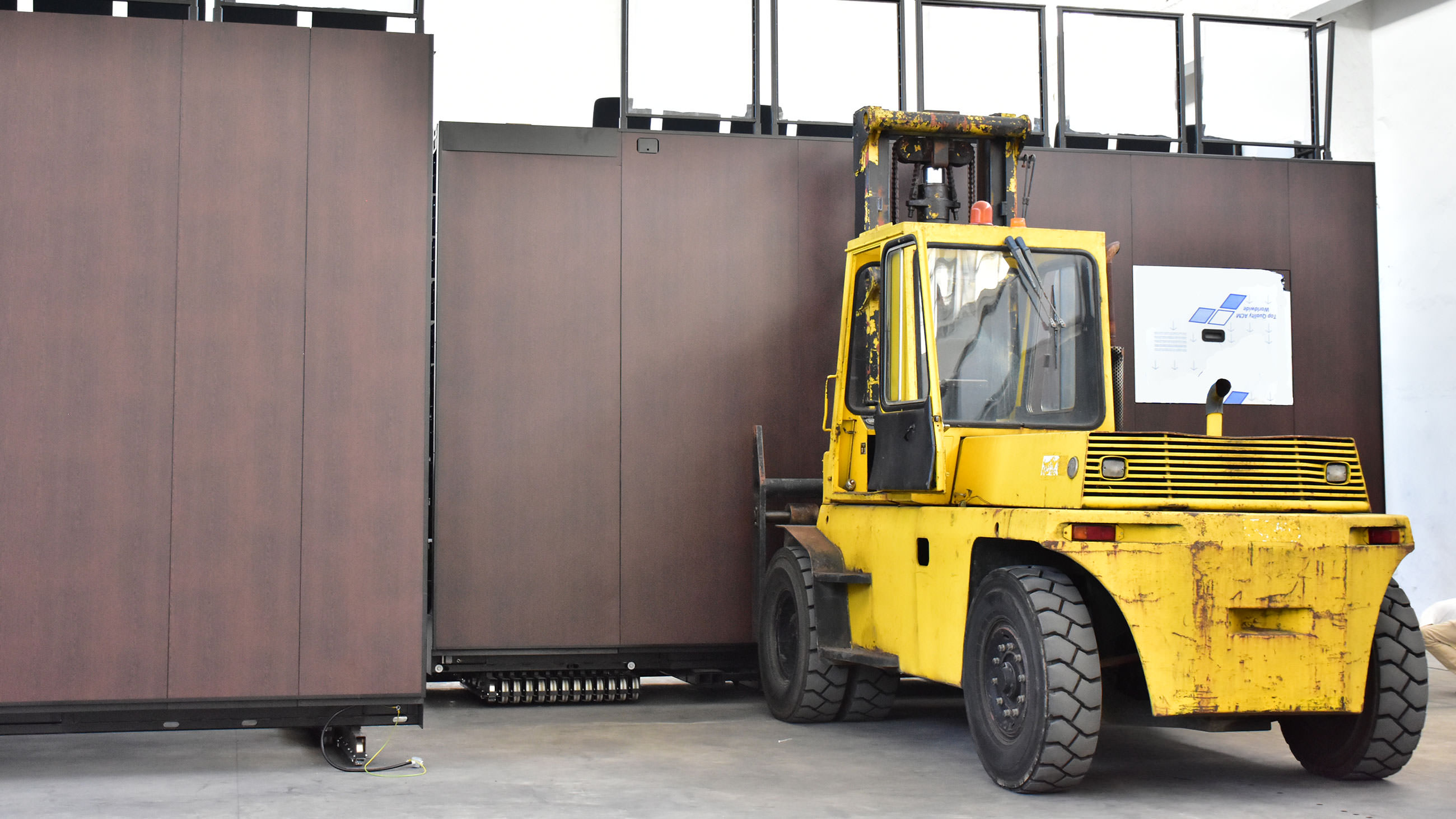 Die mobile TransFlex Teleskoptribüne kann mit einem Hubtransportfahrzeug, aber auch mit einem Gabelstapler bewegt werden.
